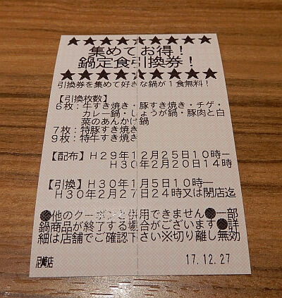 やよい軒さんのキャンペーンで鍋定食を6回食べると、1鍋定食が無料になるという。