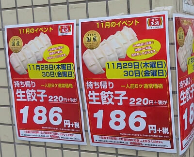王将尼崎三和店は今月末の29日、30日は生餃子が安い。