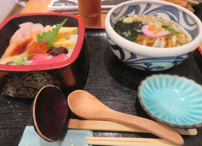 うどんと寿司三貫とカキフライという不思議な組み合わせだ。